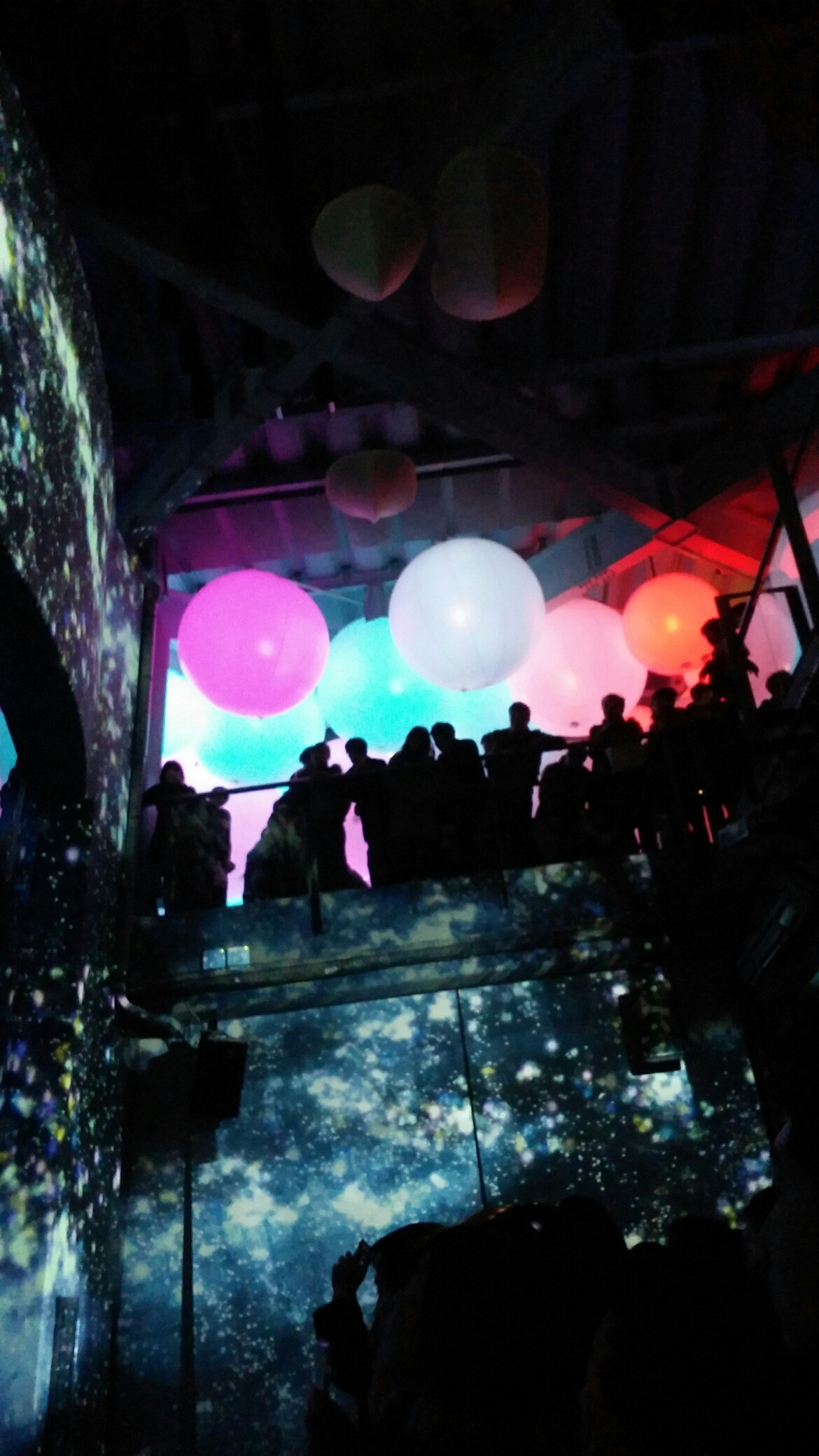 2階の辺り。さんざん邪魔だと言われていた球体に光が灯り、光の橋の上に立っているように見えるその姿は、まるで異次元から見下ろす人の群れ。